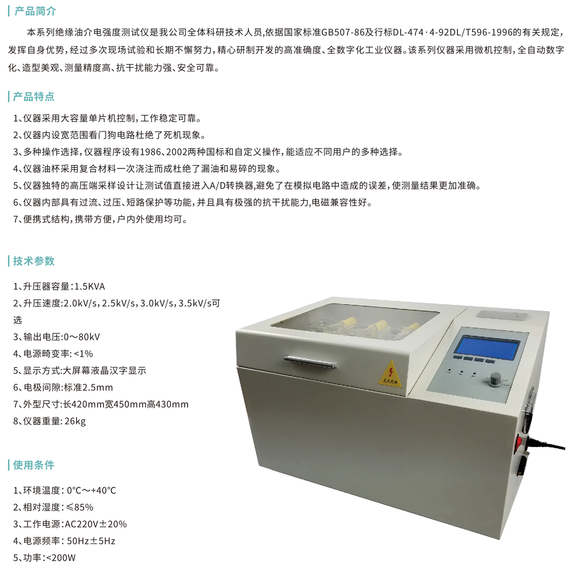 本系列絕緣油介電強度測試儀是我公司全體科研技術人員,依據國家標準GB507-86及行標DL-474·4-92DL/T596-1996的有關規定, 發揮自身優勢,經過多次現場試驗和長期不懈努力,精心研制開發的高準確度、全數字化工業儀器。該系列儀器采用微機控制,全自動數字 化、造型美觀、測量精度高、抗干擾能力強、安全可靠。